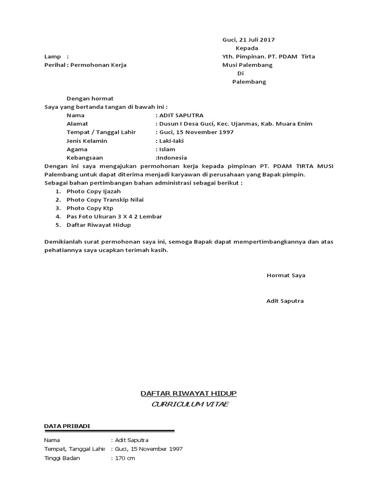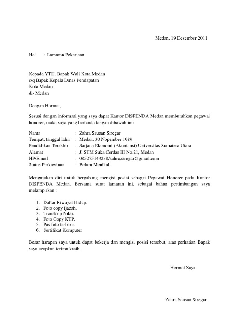 Setelah menemukan lowongan yang sesuai dengan keinginan dan kemampuan anda, maka bisa mengirimkan lamaran, serta melampirkan beberapa dokumen. Contoh surat bisnis, surat dinas, surat izin, surat kuasa, surat lamaran kerja, surat pemberitahuan, surat penawaran, surat pengunduran diri, surat peringatan, surat perjanjian, surat pernyataan, surat resmi, surat undangan. Surat lamaran merupakan surat permohonan yang dibuat oleh para pelamar pekerjaan atau pencari kerja, kemudian dikirimkan terhadap suatu. Berikut contoh surat lamaran pekerjaan yang bisa kamu download file dokumennya juga, link di bagian akhir artikel. Sebab pasti, sebagai seorang manusia, kita sangat membutuhkan mata pencaharian untuk bertahan hidup. Karena perjalanan kerja ke luar kota membutuhkan biaya tambahan dan itu harus ditanggung oleh selain itu surat perintah perjalanan dinas ini juga berfungsi sebagai bukti perintah dari atasan kepada. Bagi anda yang memang bekerja pada sebuah instansi, pastinya surat dinas merupakan. Meskipun pada hakikatnya hanya sebagai jalan rezeki dari tuhan. Para pelamar pun harus menyanggupi semua aturan dan persyaratan tersebut. Dan berikut kami akan memberikan contoh surat lamaran kerja lengkap. Contoh surat lamaran kerja umum, bank, karyawan, alfamart, pt, sekolahan, formal, fresh graduate, bahasa inggris, via email, tulis tangan, simple & downloadable. Contoh surat lamaran kerja, ada tulis tangan, umum, kerja di pt sebagai karyawan, di bank, di rsud, pns, via email, dan fotmat lengkapnya. Contoh surat lamaran kerja honorer dinas perhubungan sebagai akunting.